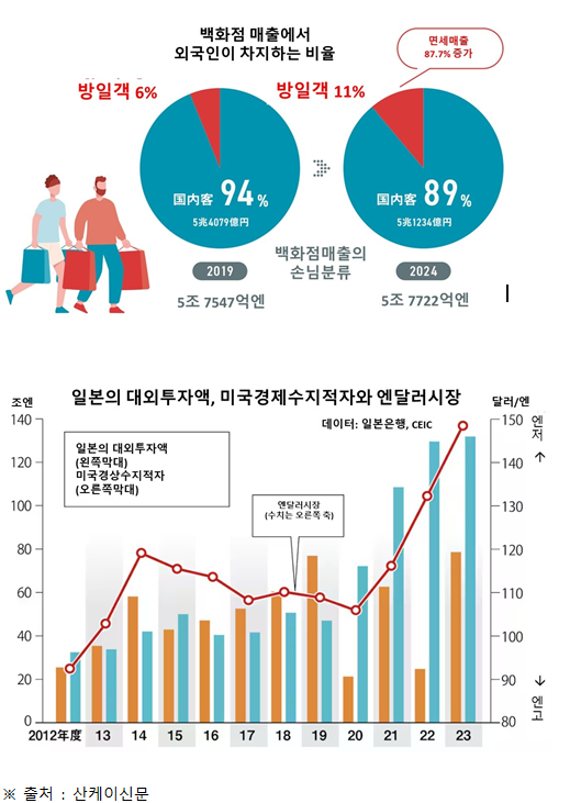 일본 주요 백화점에서 면세 매출이 급격히 증가한 이유는 무엇보다도 엔저(円安) 현상이 자리 잡고 있기 때문이다. 다시 말해 달러 대비 엔화가 저렴해지면서, 외국인 관광객들이 일본에서 고급 상품을 더 저렴하게 구매할 수 있게 되었고, 특히 코로나19 펜데믹이 모두 해소된 이후 일본으로 들어오는 전세계의 국경이 개방되면서, 인바운드 관광 수요와 함께, 쇼핑에 대한 수요 역시 폭발적인 상승세에 있다는 점도 알 수 있다. 특히 2024 ~ 2025년에 들어서 백화점들은 외국인 관광객 유치를 위해 전용 면세 카운터와 전담 통역 인력의 배치, VIP 라운지 확장 등 고급 서비스를 한층 강화하였고, 도쿄의 긴자, 신주쿠, 오사카 우메다 등의 면세에 있어서 핵심 점포를 중심으로 면세 매출이 전체 매출의 절반에 육박하는 수준까지 오른 사례도 보고되었다.