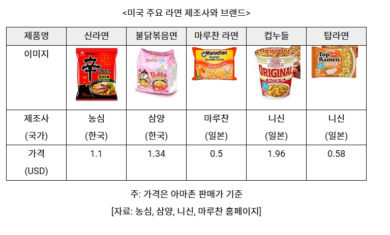 자료: Forbes, Fortune, Business Insights, Global Trade Atlas, US Food, 농심, 삼양, Nissin, Maruchan, KOTRA 뉴욕무역관 자료 종합