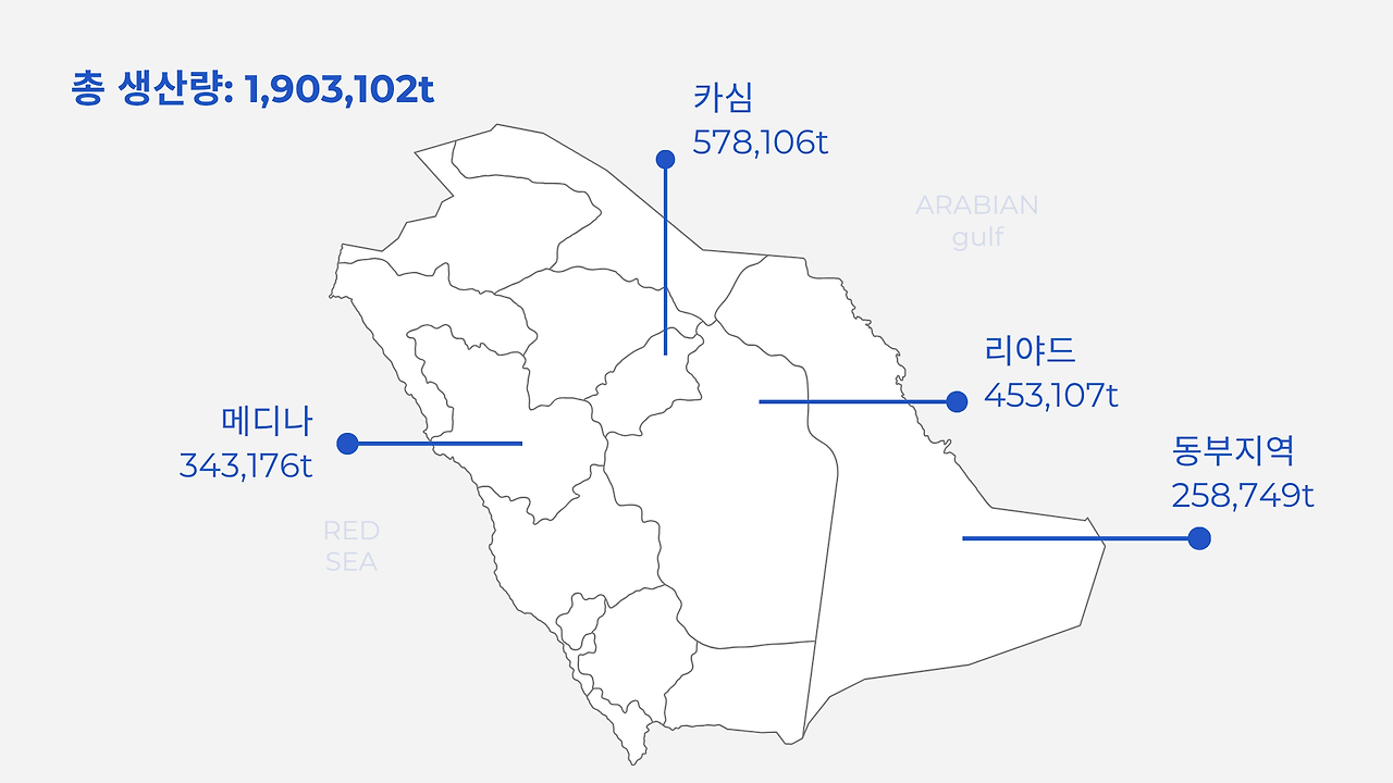 사우디 내 생산 기반은 카심 지역이 약 57만8000톤으로 최대 생산지로 꼽힌다. 이어 리야드, 메디나, 동부 지역 이렇게 총 4개 지역이 전체 생산량의 85% 이상을 차지하며 핵심 생산지로 꼽힌다.