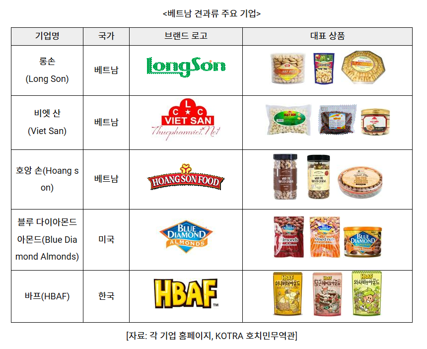 베트남 견과류 시장은 롱손(Long Son), 비엣 산(Viet San), 호앙 손(Hoang Son) 등 현지 기업이 주도하고 있으며, 캐슈넛을 중심으로 다양한 가공, 포장 제품을 생산해 내수와 수출 모두를 겨냥하고 있다. 미국의 블루 다이아몬드 아몬드(Blue Diamond Almonds)와 한국의 바프(HBAF)와 같은 해외 기업들도 고급 견과류와 프리미엄 스낵류로 시장에 진입해 경쟁을 심화하고 있다. 이는 베트남 소비자들의 건강식품 선호 증가와 높아진 글로벌 브랜드에 대한 선호에 기인한다. 현지 기업들은 가격 경쟁력과 원재료 접근성을 강점으로 삼는 반면, 해외 기업들은 제품 차별화와 다양한 맛, 프리미엄 포지셔닝을 통해 중산층 및 젊은 소비자층을 공략하고 있다.