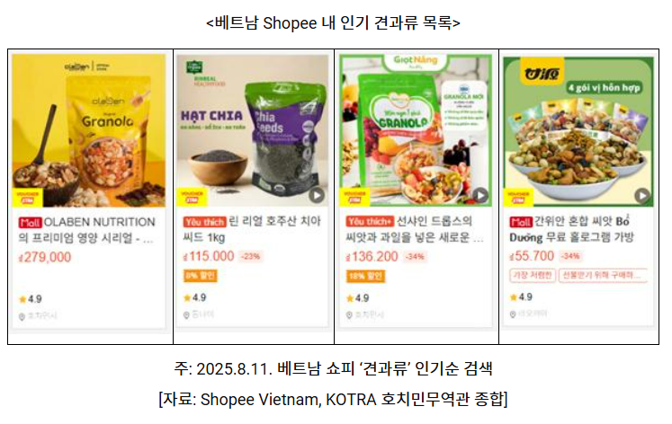 베트남 견과류 시장은 건강식품 수요 증가와 함께 꾸준히 성장하고 있다. 베트남 소비자의 건강 간식과 프리미엄 제품에 대한 수요가 높아지면서 가공 견과류의 소비 기반도 빠르게 확대되고 있다. 특히 온라인 유통망 확충과 현대적 대형 유통채널 및 편의점 등의 확대는 한국산 프리미엄 견과류의 시장 접근성을 높이는 기회로 작용할 수 있다.