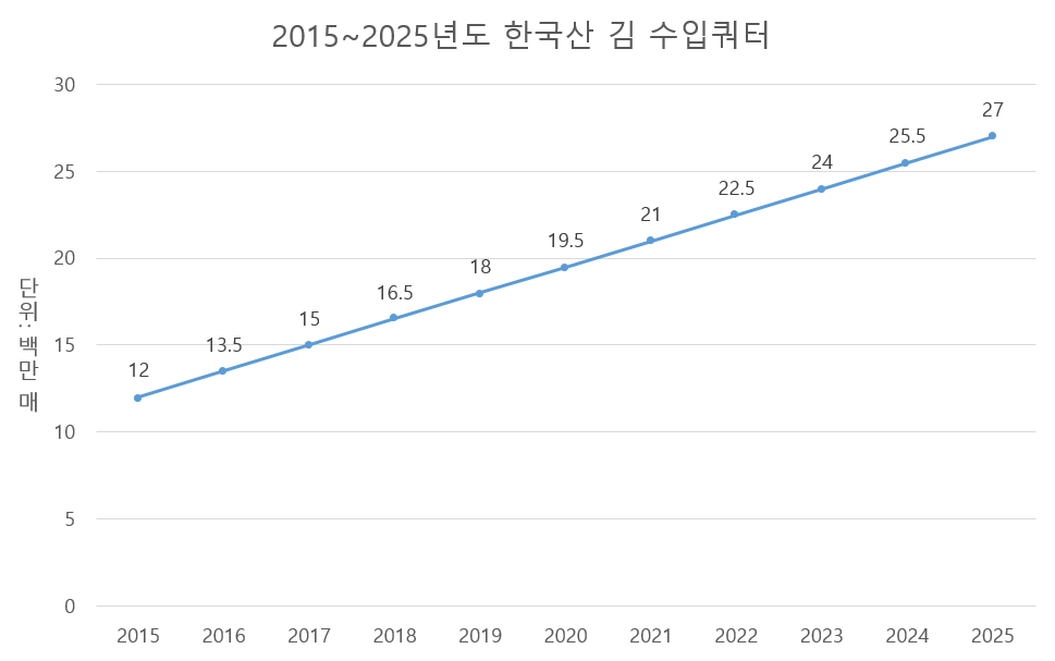 김 흉작으로 인해 일본 김 생산량이 급감하고 가격이 크게 오르면서 한국산 김에 대한 수요는 앞으로 계속 증가할 것으로 전망된다. 따라서 2025년 27억 장으로 예정되어 있는 한국산 김 수요 쿼터 역시 2026년 이후 더 늘어날 것으로 기대된다. 한국산 김이 일본에서 꾸준한 경쟁력을 확보하기 위해서는, 일정 수준 이상의 품질과 안정적인 공급과 가격이 유지될 수 있도록 꾸준한 노력을 기울일 필요가 있다.