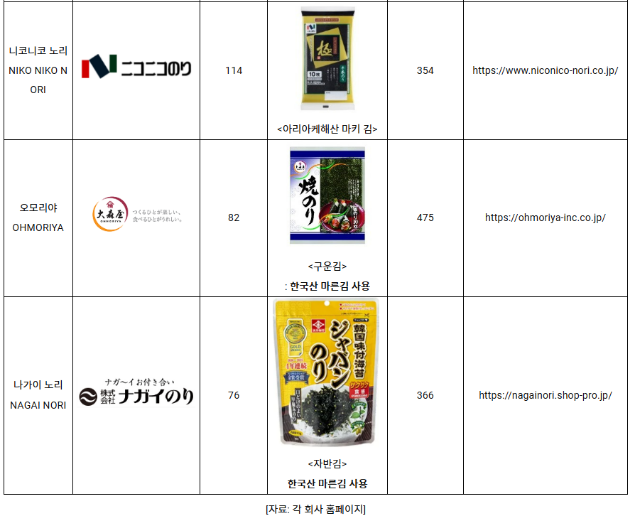 한국농수산식품유통공사에 따르면, 올해 4월 29일 기준 한국 김도 수차례 가격 인상은 있었지만 마른 김이 장당 평균 130원을 기록하였으며, 일본 물가로 따지만 약 15엔 정도로 가격경쟁력 측면에서 여전히 우위에 있다. 또한 K-푸드에 대한 긍정적인 인식에 힘입어 한국 김에 대한 일본 식품회사들의 관심이 증가하고 있다. 해양수산부는 작년 5월 도쿄에서 개최된 ‘2023년도 대일 한국 김 수출 입찰 상담회’에서 전년 대비 61.5% 증가한 1,050억 원 규모의 김 수출 계약을 체결했다고 발표한 바 있다. 니코니코노리 담당자 A 씨는 “한국산 김 수입을 통해 소비자들의 니즈를 충족시키고 국내 김 수량 부족 문제 해결에 도움이 될 것이다”라고 밝혔다.