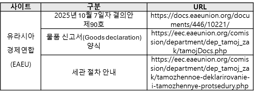 유라시아경제위원회(EEC) 이사회가 2025년 10월 7일자 결의안 제90호를 채택함에 따라 수출입 물품 신고서(Goods declaration) 관련 규정이 일부 변경되었음.