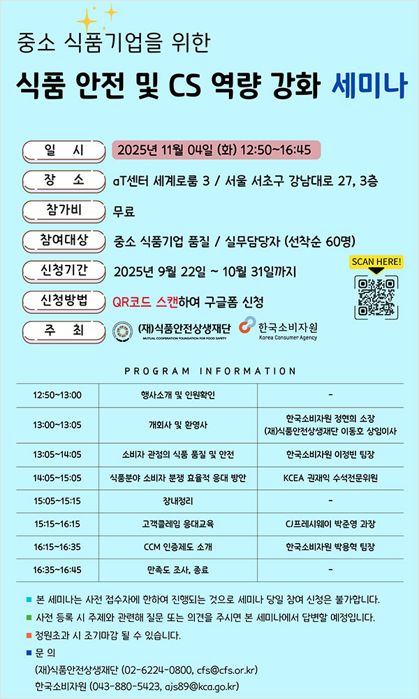 (재)식품안전상생재단은 오는 11월 4일 오후 12시 50분부터 16시 45분까지, 서울 서초구 aT센터 세계로룸-3에서 ‘중소 식품기업을 위한 식품 안전 및 CS 역량 강화 세미나’를 개최한다.