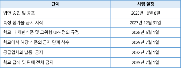 - 캘리포니아 주의 유치원부터 공립 고등학교까지 학교 내 제한식품 및 고위험 초가공식품의 제공을 단계적으로 금지하고,