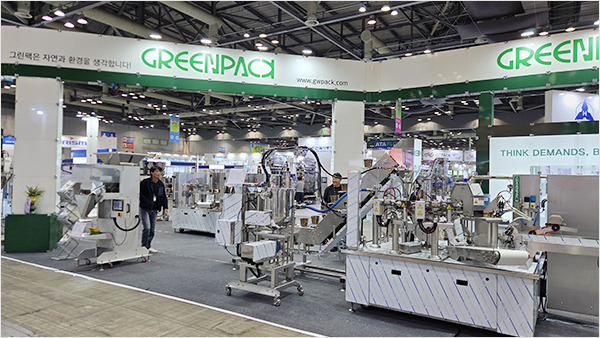 분말이나 고체 제품을 다루는 기업들도 이목을 끌었다. (주)그린팩은 분말이나 고체 제품을 자동으로 계량하고 포장하는 설비 전문기업으로, 밀가루, 커피, 분유 등 각종 분말을 정량으로 충진하는 ‘분말 충전기(Auger Filler)’와 이미 만들어진 파우치에 제품을 담고 밀봉하는 ‘로타리 포장기(Rotary Packaging Machine)’를 전시했다. 특히 과자, 시리얼, 냉동식품 등을 정확한 중량으로 조합·계량하는 ‘조합식 계량기(Multihead Weigher)’ 및 이를 연동한 ‘버티칼 포장기(Vertical Packaging Machine)’가 주목받았다.