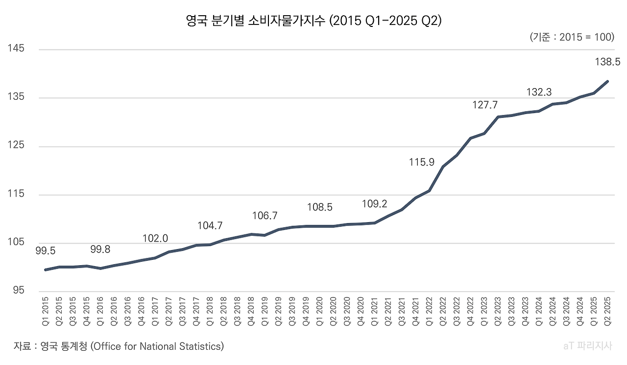 인플레이션을 가늠하는 대표적인 척도인 소비자물가지수(CPI)도 상승세를 이어가고 있다. 2025년 9월 기준 소비자물가지수는 전년 동월 대비 3.8% 상승했다. 영국 통계청에서 사용하는 또 다른 인플레이션 지표인 자가주거비 포함 소비자물가지수(CPIH) 역시 전년 동월 대비 4.1% 상승했다.