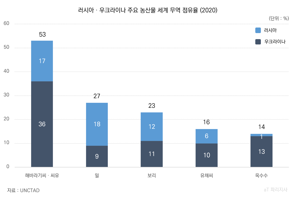 식료품 물가 상승에는 러시아의 우크라이나 침공이 큰 영향을 미쳤다. 2020년 기준 러시아와 우크라이나는 세계 시장에서 거래되는 해바라기씨·씨유 53%(러시아 17%, 우크라이나 36%), 밀 27%(러시아 18%, 우크라이나 9%), 보리 23%(러시아 12%, 우크라이나 11%)를 차지한 주요 농산물 생산국이다. 러우 전쟁이 격화되면서 위 품목의 수출이 제한되었고, 해바라기씨유와 밀가루 기반 식품의 가격이 상승했다.