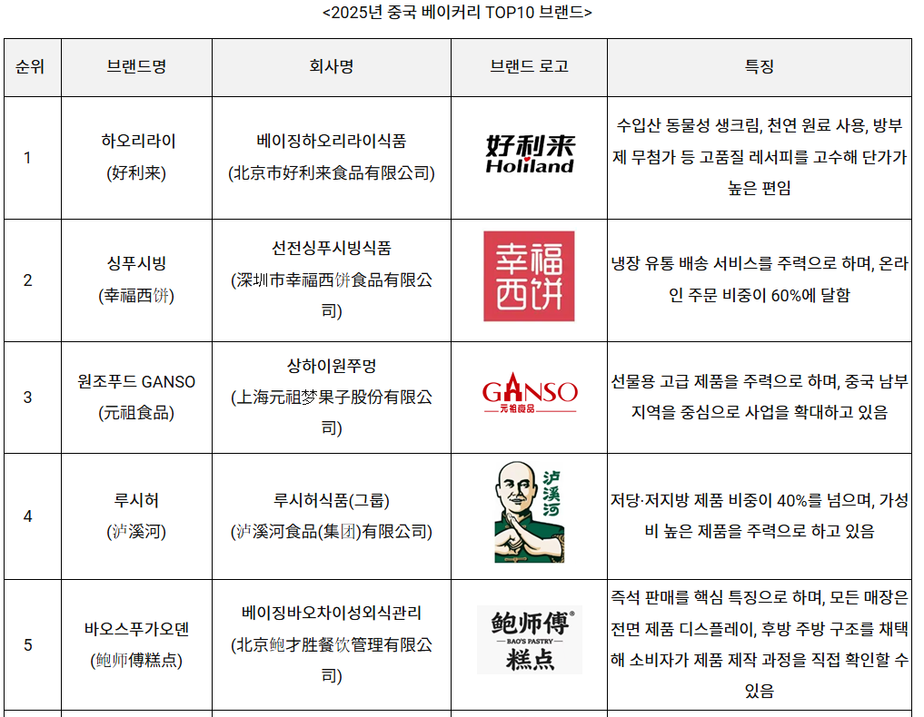 1위를 차지한 ‘하오리라이(好利来)’는 수입산 동물성 생크림 및 천연 원료를 사용하고, 방부제 무첨가를 추구하는 등 고품질 베이커리 시장을 선도하고 있다. 4위를 차지한 ‘루시허(泸溪河)’는 서양식 재료인 치즈, 크림, 초콜릿 등과 중국 식재료를 결합해 유니크한 제품을 출시하고 있다. 루시허의 뒤를 이어 5위를 차지한 ‘바오스푸가오뎬(鲍师傅糕点)’도 지속적으로 창의적인 제품을 개발하고 있으며, 그중 고기 가루가 들어간 마들렌 모양의 케이크인 '러우쏭샤오베이(肉松小贝)'는 연간 판매량이 1억2000만 개를 넘었다.