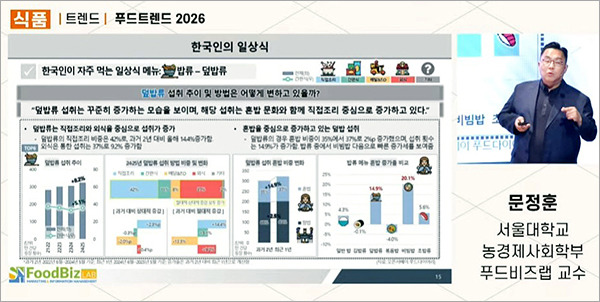 서울대학교 푸드비즈니스랩 문정훈 교수는 '2026 식품외식산업 전망' 발표회에서 오픈서베이, 농촌진흥청, 카카오헬스케어, 민텔 등 다양한 기관과의 협업 연구 결과를 바탕으로 이같이 밝혔다. 문 교수는 "데이터 분석 결과, 건강 지향성 심화와 구매 채널의 변화라는 큰 흐름 속에서 소비 패턴이 세분화되고 있다"며 "특정 소비층이 특정 식품군에 몰입하는 '구획화'와 '편중화' 현상이 심화되면서 기업들은 더욱 정교한 시장 분석과 대응 전략이 필요하다"고 강조했다.
