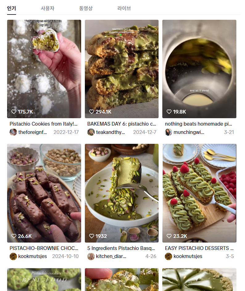 틱톡에서는 꾸준히 피스타치오를 활용한 레시피 영상이 업로드되고 있다. 피스타치오 쿠키, 케이크, 버터 스프레드, 라떼 등 디저트와 음료 전반에서 피스타치오를 접목하는 방식이 하나의 콘텐츠 흐름으로 자리 잡았다. 특히 피스타치오 크림 쿠키 영상은 29만 회가 넘는 조회수를 기록하며 화제를 모았다.