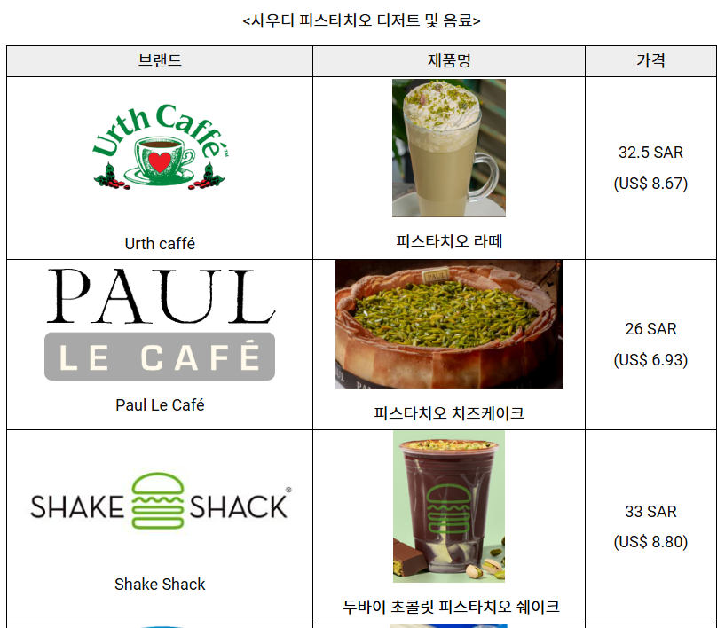 이 제품을 계기로 피스타치오는 단순한 부재료가 아닌 디저트의 핵심 재료로 재조명됐으며, 전 세계 소비자들 사이에서 ‘고급스럽고 감각적인 맛’의 상징으로 부상했다. 이러한 글로벌 흐름은 사우디에도 빠르게 확산됐다. 현지 카페 매장에서는 피스타치오를 활용한 메뉴가 잇따라 출시되며, 이제 피스타치오는 사우디 디저트 문화를 대표하는 아이콘으로 자리 잡았다.