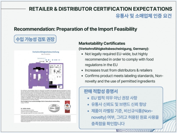 캠퍼 대표는 유럽에서 사용되는 ‘시장성 인증서(Marketability Certificate)’를 언급하며, “이 서류는 제품이 현지 규정을 준수한다는 것을 증명하는 내부 문서로, 수출 전부터 준비하면 바이어 신뢰를 높이고 협상을 훨씬 유리하게 만들 수 있다”고 조언했다.
