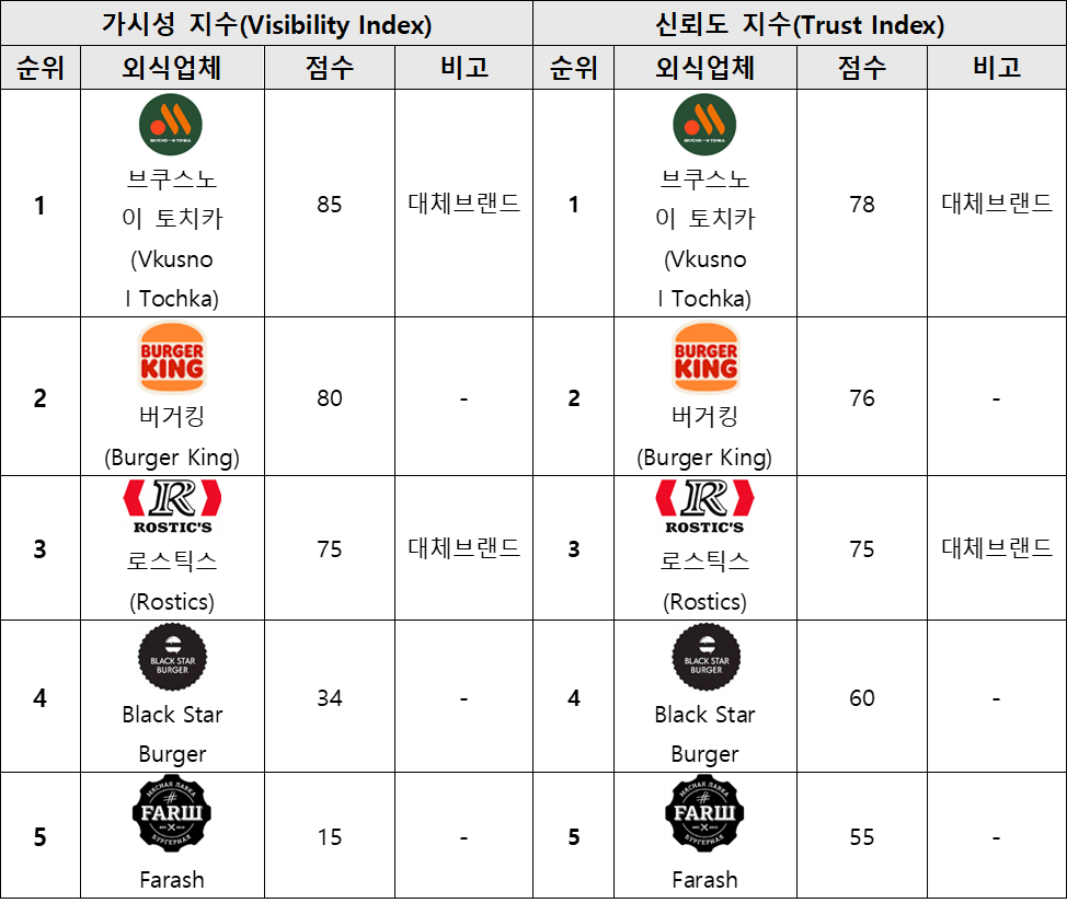 러시아 여론조사기관 로미르(Romir)는 매년 GRI(Global Reputation Index)에 기반해 부문별 ‘가시성 지수(Visibility Index)’와 ‘신뢰도 지수(Trust Index)’를 발표하고 있다. 두 지수는 전체적인 기업 평판을 평가하는 중요한 기준으로 작용하며, 외식업체 대체브랜드들이 성공적으로 시장에 안착한 주요 근거로 활용되기도 한다.