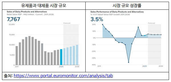 2025년 9월에 발표된 유로모니터 (Euromonitor)의 보고서에 따르면 2024년 홍콩의 유제품과 그 대체 제품의 시장규모는 HKD 7,506백만 달러로 2023년의 HKD 7,246백만 달러 대비 약 3.5%의 증가세를 기록했으며 2025년에는 HKD 7,767백만 달러를 기록하고 2030년에는 HKD 9,890백만 달러까지 늘어날 것으로 예상된다고 한다.