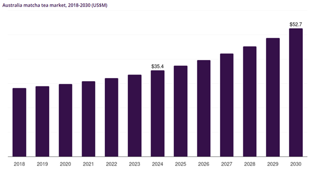 글로벌 조사기관 Grand View Research에 따르면, 호주의 말차 시장은 2024년에 3540만 미 달러의 매출을 기록했으며, 2030년에는 5270만 미 달러에 이를 것으로 예상된다. 2025년부터 2030년까지 연평균 성장률(CAGR)은 7.1%로 전망되며, 제품 부문별로는 2024년 기준 파우더 형태의 제품이 가장 큰 매출을 차지한 것으로 나타났다.