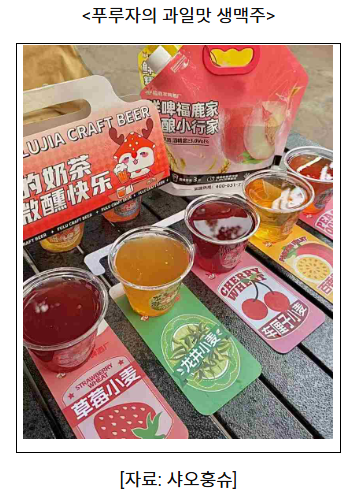 한편 셴피푸루자(鲜啤福鹿家)는 기존의 ‘맥주 애호가’ 중심 브랜드들과 달리 합리적인 가격대와 일반 Z세대 소비자의 취향을 겨냥한 제품 전략을 채택하고 있다. 전통적인 생맥주 외에도 차(茶)의 향을 더한 차맥주(茶啤), 과일맥주 등 다양한 제품군을 보유하고 있으며, 알코올 도수 역시 2.3~5도 수준으로 비교적 낮아 젊은 소비층의 선호를 얻고 있다.