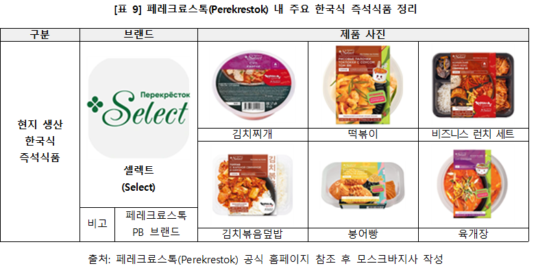 지난해 10월 엑스파이브(X5 Group) 산하 소매업체 페레크료스톡(Perekrestok)은 자사 보유 PB 브랜드인 셀렉트(Select)에 한국식 즉석식품 라인업을 추가했다. 페레크료스톡(Perekrestok) 라인업 개발 단계에서 유명 한식당의 현지인 요리사들이 참여해 즉석식품의 품질과 완성도를 획기적으로 높였다고 밝혔다.