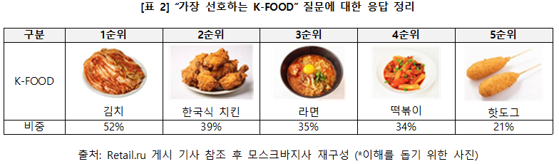 최근 러시아에서는 한국 문화, 즉 한류에 대한 긍정적인 인식이 확산되고 있으며, 특히 K-FOOD에 대한 선호도가 높게 나타나고 있다.