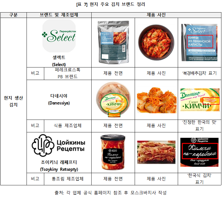 현재 주요 소매업체의 매대에서도 김치를 쉽게 찾아볼 수 있는데, 주로 한국 혹은 중국 업체에서 납품한 경우가 대부분이다. 주목할 점은 최근 일부 러시아 식품 제조업체서도 당근이 아닌 배추를 기반으로 한 한국식 김치를 자체 생산하기 시작했다는 것이며, 주요 김치 제조업체들은 하기와 같다.