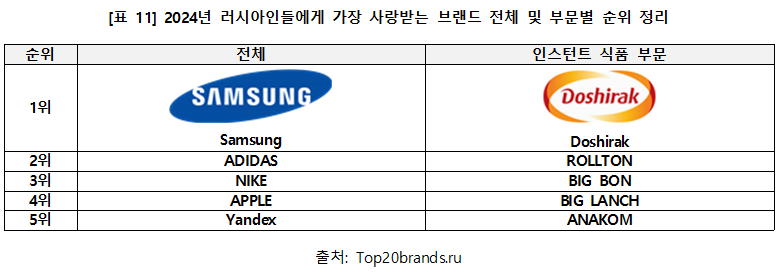 이는 러시아 시장조사기관 OMI(Online Market Intelligence)가 거주인구 100만 명 이상의 대도시 출신 약1천5백명을 대상으로 매년 진행하고 있는 ‘러시아인들에게 가장 사랑받는 브랜드(Russians' favorite brands)’ 순위에서도 여실히 드러나고 있다.지난해 전체 브랜드 수위 1위는 우리나라의 삼성전자가 차지했으며, 인스턴트 식품 부문에서는 팔도 도시락(Doshirak)이 1위를 차지했다.