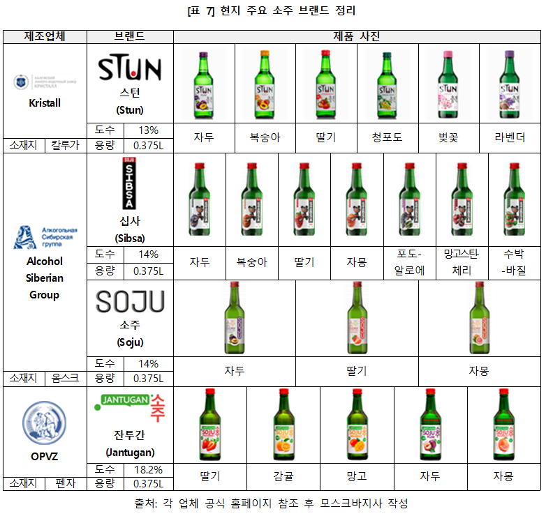 이를 두고 닐슨아이큐(NielsenIQ)와 관련 전문가들은 현지 제조업체들이 저렴한 가격으로 소주를 생산한 것이 소주 시장 성장을 이끈 주요 요인이라고 평가하고 있다. 실제로 현지 주류 제조업체들은 2023년 하반기부터 ‘스턴(Stun)’, ‘십사(Sibsa)’, ‘소주(Soju)’, ‘잔투간(Jantugan)’ 등의 소주 브랜드를 출시, 및 생산을 확대해오고 있다.