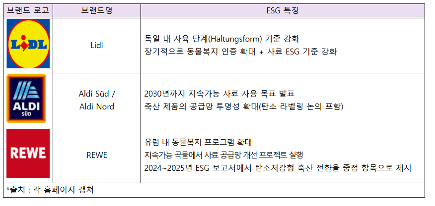독일 대형 유통기업들은 모두 “탄소저감형 축산과 재생농업 기반 사료, 공급망 ESG”를 핵심 전략으로 설정했다.