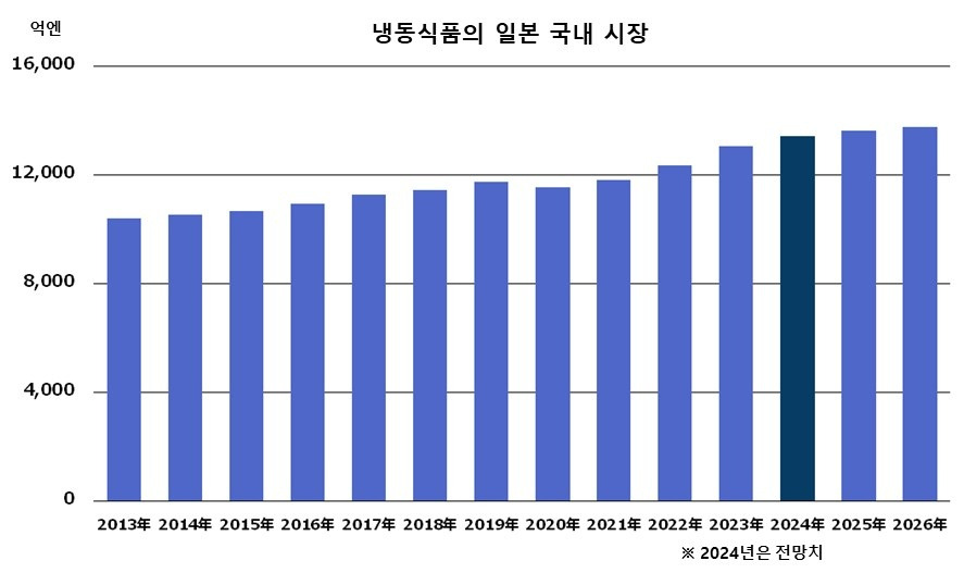 냉동식품의 시장 규모는 2022년 기준으로 1조 2천억 엔을 돌파하였다. 이후 원자재 급등에 따른 가격 인상으로 소비자들의 일부 사재기 현상도 있었지만, 간편성을 높인 원플레이트 형 제품 등 부가가치가 높은 상품이 호조를 보이면서 전체 매출은 늘어나는 추세이다. 2023년 코로나19가 5류(경증 분류 및 비용의 자비 부담)로 전환된 이후 외식 수요가 증가하며 증가세가 이어지고 있지만, 2024년은 수요가 진정되면서 전년과 비교하면 증가세가 다소 둔화하였다. 냉동식품은 높아지는 시간 단축 및 간편성의 요구에 대응하고 있어서, 향후 시장 확대가 계속될 것으로 예측된다. 업무용은 외식업체의 일손 부족에 대응하는 간편성을 결합한 상품이나 고품질 상품의 개발, 시판용은 외식 품질의 상품이나 원 플레이트형 등의 상품 형태의 확대, 메이커의 공장 증설, TV CM에서의 상품 노출 증가로 상승세를 이어갈 것으로 보인다.