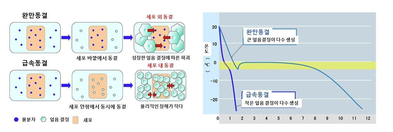 식품을 보존하는 방법으로 통조림, 냉동, 건조, 염장, 훈제 등 여러 가지가 있는데, 이 중에서 냉동은 색, 맛, 향, 성분, 식감, 신선도 등 식품이 원래 가지고 있는 상태를 장시간 보존 가능한 방법이다. 다만 식품을 냉동할 때는 식품 안에 얼음 결정이 생겨 식품 내부를 파괴할 수 있다. 식품의 내부가 얼음에 의해 파괴되는 경우, 제품을 해동하면 드립이라고 하는 액체가 발생한다. 이 드립 속에는 다양한 영양 성분과 감칠맛 성분이 함유되어 있어서, 맛과 신선도가 떨어지게 되며, 또한 얼음에 의한 조직 파괴로 인하여 식감도 바뀌게 된다. 천천히 얼리는(완만 동결) 식품 속의 얼음이 큰 결정이 생성되고, 재빠르게 얼리는(급속 동결) 경우에는 작은 결정이 생성되기 때문에, 식품의 파괴를 최소한으로 억제하려면, 재빠르게 얼리는 것이 좋으나, 그에 상응하는 큰 에너지가 필요하다. 이러한 냉동 기술은 식품의 종류와 크기, 냉동 방법에 따라 동결 속도는 달라지는데, 에너지 절약과 고품질이라는 관점에서 보면, 식품마다 최적의 동결 조건 및 방법은 제각각이라고 할 수 있다. 최근에는 동결 식품에 생기는 얼음 결정의 크기와 모양을 분석함으로써 동결이 식품에 미치는 영향을 확인하고 각각의 식품에 알맞은 동결 방법을 연구하고 있다.