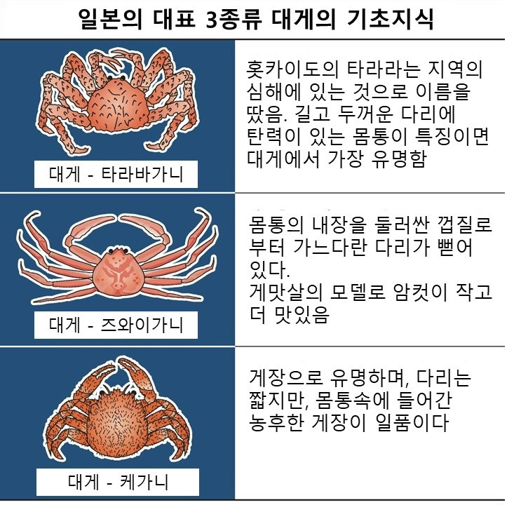 일본 연안의 대게잡이가 12월 6일을 기점으로 정식 재개된다. 언젠가는 직접 산지에서 맛을 보고 싶다고 생각한다면, 이번 겨울이야말로 좋은 기회라고 하겠다. 올해의 경우 바다에 있는 대게 자원량은 1999년 조사를 시작한 이래 가장 많을 것으로 전망되며, 안정적인 공급과 가격이 형성될 것으로 보인다. 내년 겨울 이후에는 반대로 대게의 「낮은 산란」에 의하여, 10년 가까이 자원의 침체가 계속될 것으로 예측된다. 일본에서 소비되는 대게는 크게 3종류가 있는데, 굵은 다리로 살에 탄력이 있는 다라바 가니, 게장으로 유명한 케 가니, 다리가 길고 살이 섬세해 '대게의 여왕'이라 불리는 즈와이 가니 이렇게 3종류를 들 수 있다. 대게의 주산지는 호쿠리쿠(일본 북부)에서 산음(칸사이 지역)에 걸친 연안으로, 어획 시기는 매년 11월부터 다음 해의 3월 말이다.