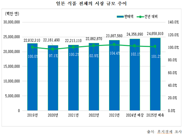 2024년 일본 식품 시장은 소비자의 절약 성향 강화로 인해 저가 제품 수요가 증가했음에도 불구하고, 제품 가격 조정의 영향으로 24조 3,568억 엔 규모로 확대되었다. 2025년에는 가격 조정이 이어지는 가운데 절약형 제품과 고부가가치 제품이라는 양극화된 수요가 공존하며, 시장 규모는 24조 6,589억 엔에 이를 것으로 예상된다.