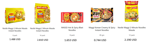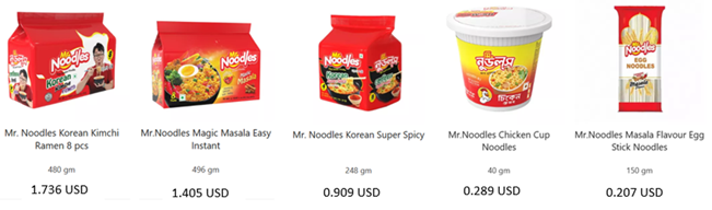 방글라데시 라면 시장의 경쟁은 가격대를 기준으로 ‘일반 시장(mass market)’과 ‘프리미엄 틈새시장(premium market)’으로 나뉘고 있다. 일반 시장은 Maggi, Mr. Noodles, Cocola 등 현지 생산 브랜드가 장악하고 있다. 이들은 가격 경쟁력, 대용량 패밀리팩 제공, 강력한 현지 유통망을 무기로 시장의 대다수를 점유하고 있다.