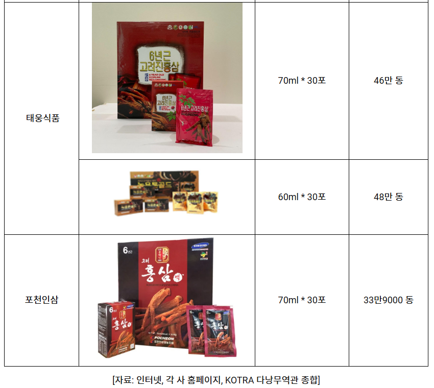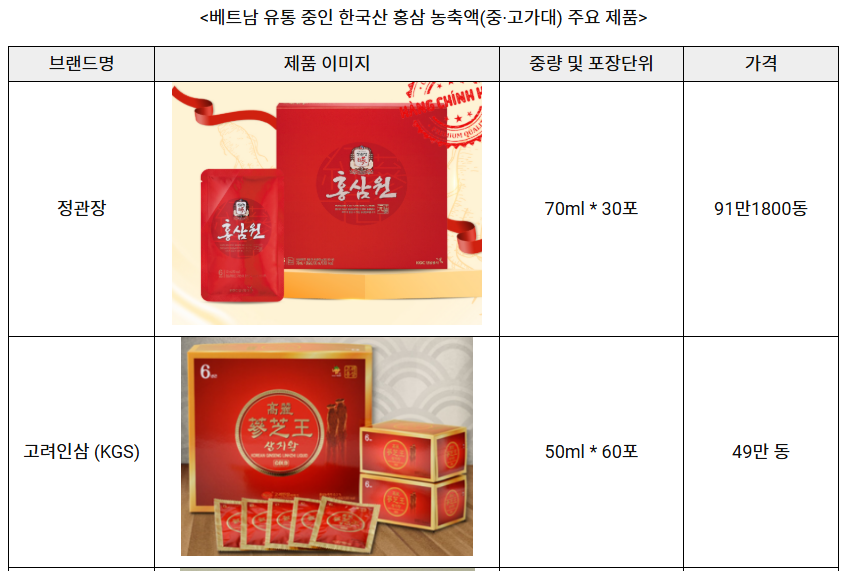 소비자들은 ‘보기 좋은’ 선물 세트(고급 박스, 금색·빨강 톤, 선물 카드 포함)에 더 높은 가치를 두는 경향이 있다. 이에 베트남으로 수입·유통되는 홍삼 제품 가운데 정관장(KGC) 등 주요 한국 브랜드들은 현지 공식몰과 오프라인 매장에서 다양한 기획 세트를 선보이며 시장 공략을 강화하고 있다. 또한 대다수 브랜드가 소비 편의성을 고려해 1회 섭취 분량으로 개별 포장된 선물용 제품을 잇따라 출시하고 있으며, 이러한 제품들은 현지 소비자들에게 높은 인기를 얻고 있다.