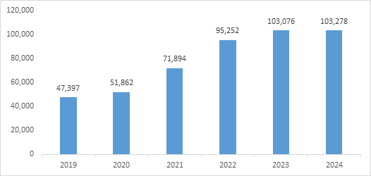 베트남 소비자가 가장 선호하는 홍삼 제품은 홍삼 음료와 홍삼농축액으로, 합리적인 가격과 간편한 섭취 방식 덕분에 가장 높은 판매량을 기록하고 있다. 홍삼 제품을 중심으로 건강기능식품 및 홍삼 제품(HS 2106.90)의 대한국 수입액은 2019년부터 2024년까지 약 118% 증가하며 고성장을 이어갔다. 특히 2021년 이후 증가 폭이 크게 확대되며, 2024년 기준 1억320만 달러 규모의 수입을 유지하고 있다.
