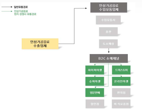 베트남에서 홍삼 음료와 홍삼 농축액의 주요 유통처는 전문 소매점, 슈퍼마켓, 홈쇼핑, 약국 등으로 나뉜다. 자체 매장이 없는 소규모 업체의 경우, 현지 도·소매상을 통해 슈퍼마켓이나 현지인이 운영하는 전문 소매점에 납품하는 방식으로 유통하고 있다.