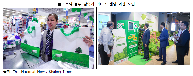 또한 플라스틱 봉투 사용을 90% 이상 줄이고 재사용 가능한 대체재로 전환했으며, 일부 매장에는 재활용 병·캔을 수거하는 리버스 벤딩 머신(Reverse Avending Machine, RVM)을 도입하기도 했다. 냉장물류 차량도 친환경 ‘그린 쿨러(Green Cooler)’ 차량으로 전환하여 식품의 안전성을 유지하면서 환경 영향을 최소화하는 노력을 병행하고 있다.