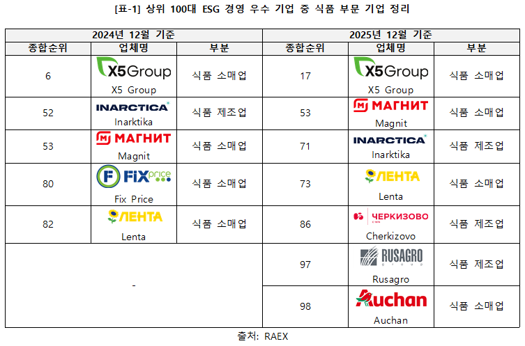 RAEX에서 발표한 2025년 12월 기준 식품 소매업체 대상 ESG 경영 평가 순위는 다음과 같다.