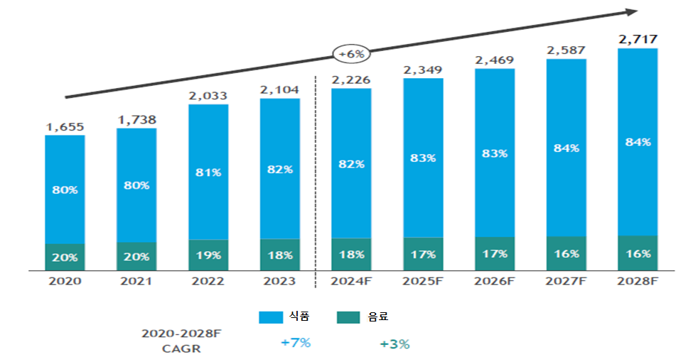 <2020~2028년 유럽 식음료 시장 연간 성장 전망 및 비중 변화>