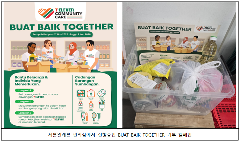 편의점 프랜차이즈 세븐일레븐은 고객들의 참여를 유도하는 기부 캠페인 BUAT BAIK TOGETHER(BE KIND TOGETHER)를 매해 진행중이다. 편의점에서 있는 음식, 위생용품, 약 등 생필품을 구매한 후 편의점 내에 있는 기부박스에 두면 주변의 취약계층에게 기부하는 형태로, 일상적인 소비를 나눔으로 자연스럽게 연결하는 참여형 사회공헌 활동이다. 지속 가능한 나눔문화 확산을 위해 기업과 소비자가 함께 참여하는 구조를 만들었다.
