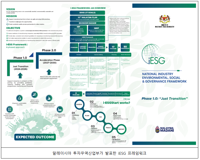 말레이시아 투자무역산업부(Ministry of Investment, Trade and Industry)가 2023년 발표한 i-ESG 프레임워크는 제조업을 중심으로 중소기업까지 폭넓게 적용할 수 있도록 설계된 국가 표준 ESG 체계로, 식품·식자재를 포함한 제조 기반 산업 전반에 직접적인 영향을 미치고 있다. 말레이시아 산업 환경과 기업 현실을 반영해 재정립한 실천 중심의 ESG 모델로, 2024~2026년 1단계 ‘정의로운 전환(Just Transition)’을 통해 ESG 기초 이행을 유도하고, 2027~2030년 고도화 가속기 단계(Acceleration Phase)를 거쳐 산업 전반의 ESG 수준을 단계적으로 끌어올리는 구조다.