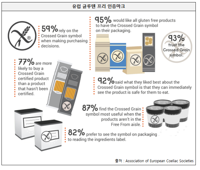 이 로고는 유럽 셀리악 협회 연합(AOECS)에서 관리하는 인증 마크로 제품이 글루텐을 포함하지 않음을 보증하며, 글루텐 불내증(셀리악병) 환자 및 글루텐 프리 식단을 따르는 사람들에게 안전하다는 것을 의미한다. 유럽 연합 Regulation (EU) No 828/2014 법적 규제에 따르면, 유럽에서 '글루텐 프리'(Gluten Free) 라벨은 글루텐 함량이 20ppm(parts per million, 백만분율) 이하인 식품에만 사용할 수 있다. 아래 그림처럼 제품 포장에서 흔히 'X' 표시가 된 밀 이삭(Crossed Grain symbol) 로고를 확인할 수 있다.