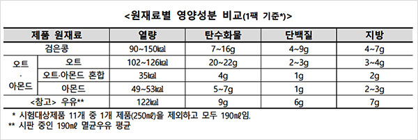한국소비자원(원장 윤수현)이 시중에 유통 중인 식물성 음료 11개 제품의 품질과 안전성을 시험·평가한 결과 검은콩, 아몬드, 오트(귀리) 등 주원료에 따라 영양학적 특성이 뚜렷하게 구분됐다.