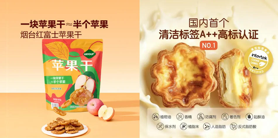 2025년 식품 진열대에서는 ‘더 많이 넣는 것’보다 ‘불필요한 것을 빼는 것’이 곧 경쟁력이 되고 있다. 성분이 ‘사과 100%’뿐인 사과 말랭이는 샘스클럽(월마트 산하 회원제 창고형 마트, Sam's Club) 내 절임·말린 과일 카테고리 판매 1위를 반년 이상 유지하며, 전체 말린 과일 및 절임류의 공정 업그레이드를 촉발했다. 허마(盒马)가 3년간 개발한 클린라벨 에그타르트는 출시 후 5일 만에 판매량이 5배 급증하며 업계의 이목을 집중시켰고, 딩동마이차이(叮咚买菜)의 ‘깨끗한 성분’ 전용 섹션은 반년 만에 약 50억 위안의 매출을 기록했다.