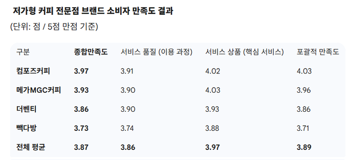 조사 대상 4개 브랜드의 종합만족도 평균은 3.87점(5점 만점)이었다. 업체별로는 컴포즈커피가 3.97점으로 1위를 차지했으며, 메가MGC커피(3.93점), 더벤티(3.86점), 빽다방(3.73점)이 뒤를 이었다.