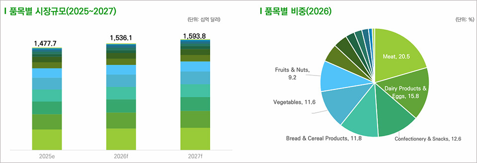 2025년 유럽 식품시장은 1조 4777억 달러 규모로, 전년 1조 4204억 달러보다 약 4% 증가한 것으로 추산된다. 품목별 점유율에서 1위를 기록한 시장은 20.5%의 비중을 차지한 육류로, 전년 대비 4.7% 증가한 3036억 달러 규모를 기록할 것으로 예상된다. 뒤이어 낙농품이 전년보다 4% 증가한 2341억 달러로 2위를 차지했으며, 스낵류가 4.4% 상승한 1862억 달러로 3위를 기록했다.