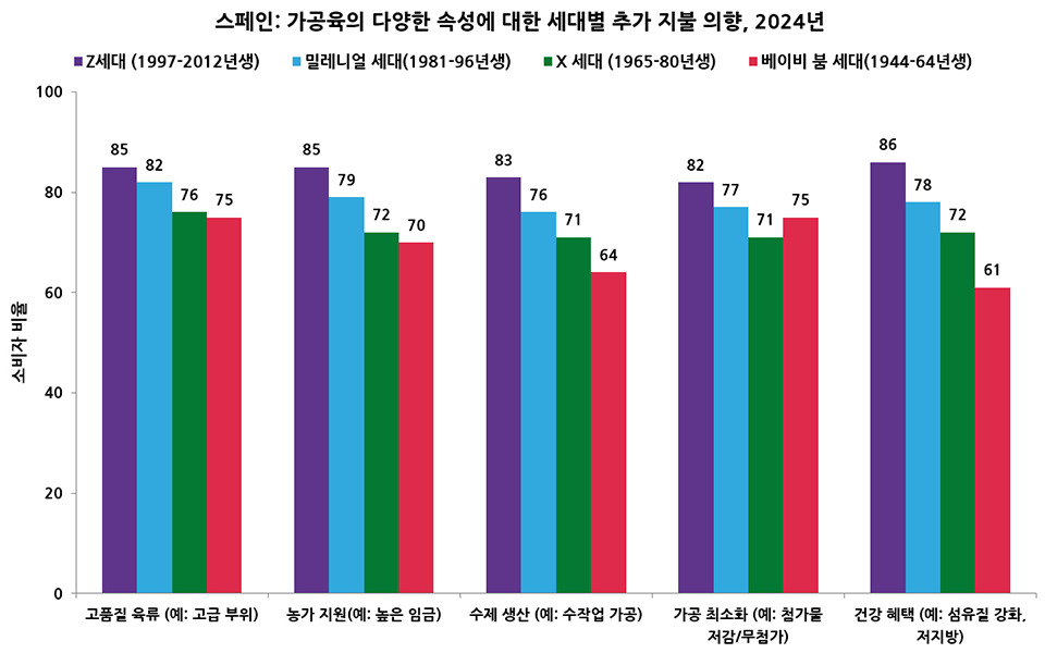 가공육의 특정 속성에 대해 더 많은 비용을 지불하려는 의향 측면에서 Z세대는 다양한 측면에서 가장 적극적인 세대로 부각된다.