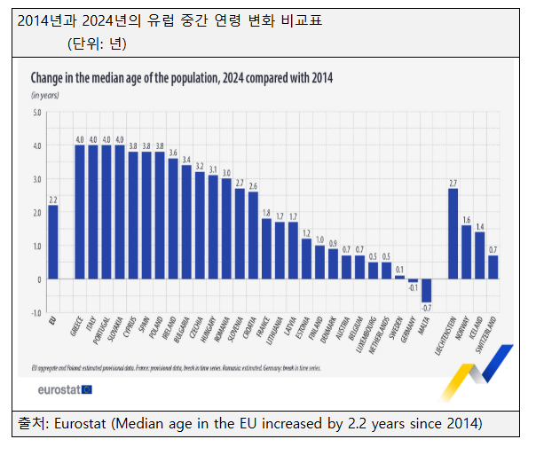 유럽통계청(Eurostat)에 따르면 EU의 중간 연령은 2014년 이후 2.2년 증가하였다. 2024년 1월 1일 기준 EU 인구의 중간 연령은 44.7세로, 이는 전체 인구의 절반이 44.7세 이상이고 나머지 절반은 그보다 어리다는 의미이다. 몰타(-0.7세)와 독일(-0.1세)을 제외한 대부분의 회원국에서 중간 연령이 상승하였으며, 그리스·이탈리아·포르투갈·슬로바키아는 약 4년 증가해 고령화가 가장 빠르게 진행된 국가로 나타났다.