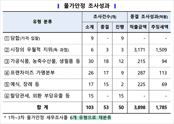 국세청은 2025년 9월부터 2026년 1월까지 1~3차 민생 침해 탈세 조사한 결과 총 103개 업체를 대상으로 1785억 원수준의 추징금을 결정한 바 있다.
