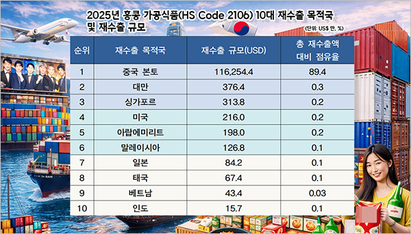 특히 K-푸드 수출국 2위를 차지하고 있는 중국을 생각하면 그 영향력을 무시할 수 없다. 실제로 홍콩의 가공식품 재수출 구조를 보면, 2025년 기준 중국이 최대 목적지로 재수출액은 11억6300만 달러, 전체의 89.4% 비중을 차지했다. 이는 홍콩이 중국 본토로 식품을 공급하는 핵심 중개무역항으로서 역할하고 있음을 보여준다.